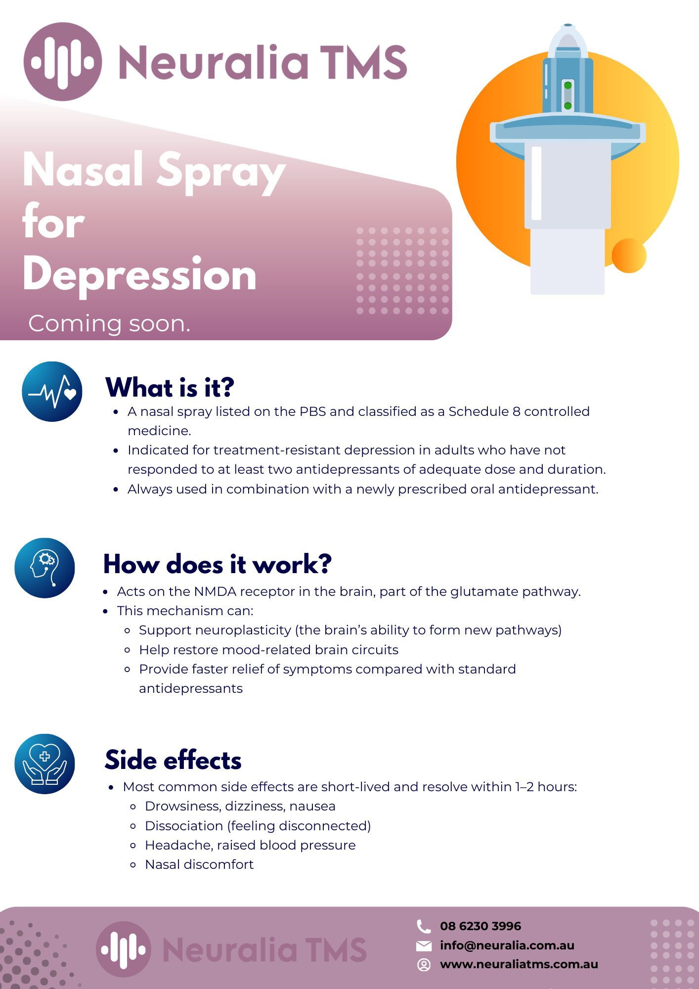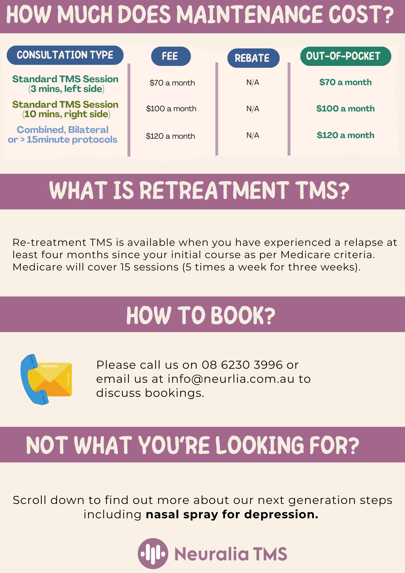 A: If you have a positive response to TMS but unfortunately begin to relapse, then Medicare will be able to cover a 15 session Retreatment TMS course (5 times a week for 3 weeks). Please call us if your mood begins to deteriorate and we will be happy to advise you on the next course of action.
